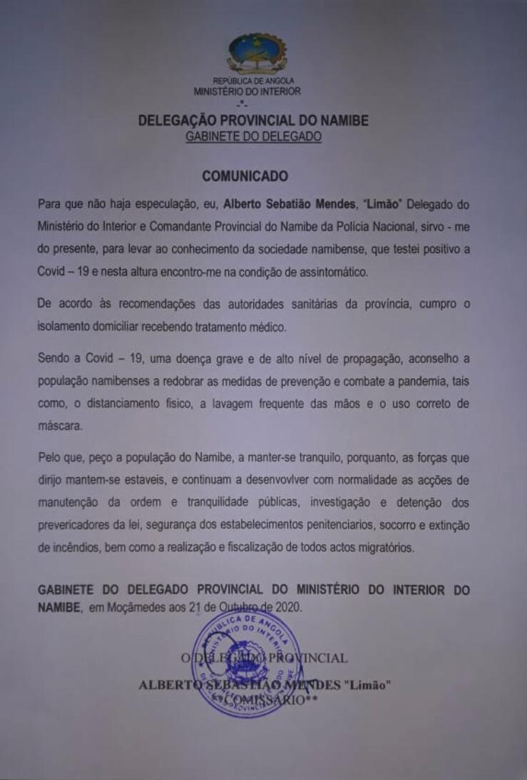 O comandante provincial da Polícia Nacional, no Namibe, comissário Alberto Sebastião Mendes “Limão” fez sair um comunicado anunciado que testou positivo a infecção do Covid-19, e que neste momento observa quarentena domiciliar tendo em conta do seu estado assintomático.