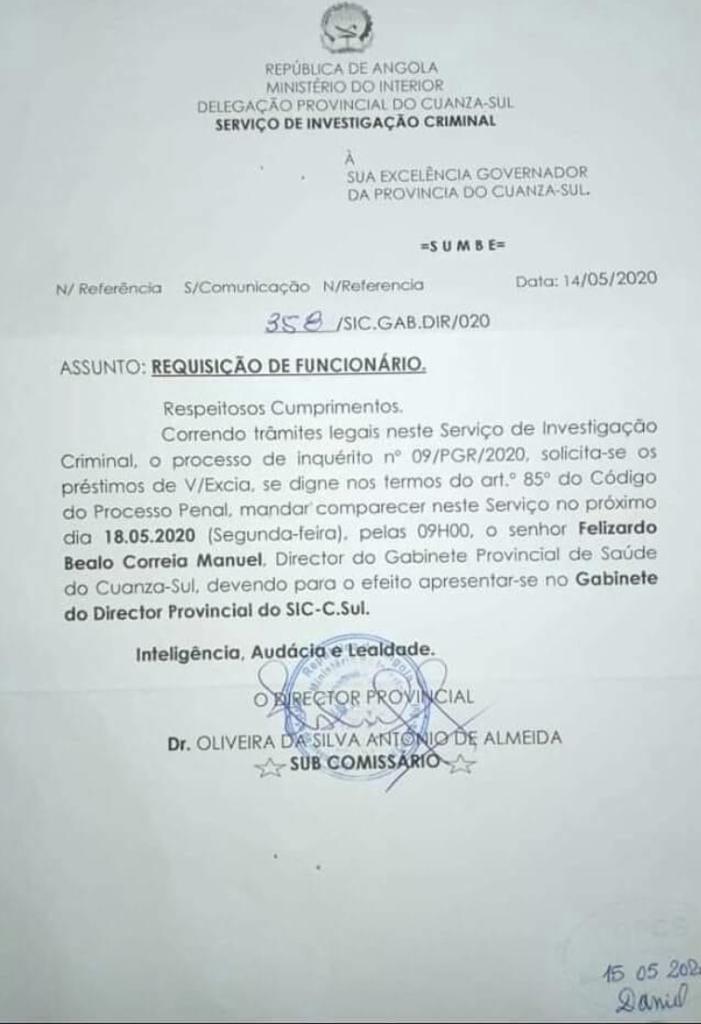 Segundo uma Requisição de Funcionarios, assinado pelo Director Provincial do Serviço de Investigação Criminal, Subcomissário Oliveira de Almeida, a que o LPN teve hoje acesso, é convocado a comparecer naquela direcção, nesta segunda-feira (17), o senhor Felizardo Bealo Correia Manuel, actual Director Provincial do Kwanza Sul, para responder o processo de inquérito n.° 09/PGR/2020, que corre os seus trâmites legais naquele Serviço de Investigação Criminal.